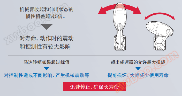 The optimal acceleration and deceleration can be automatically selected based on the posture of the robotic arm at the beginning of the action and at the end of the action. Simply input the carrying weight, the inertia moment around the R axis, and the center of gravity offset distance of the inertia moment around the R axis. The maximum torque of the motor and the maximum allowable torque of the reducer will not exceed the allowable values, and the maximum power of the motor can be exerted at any time to maintain high acceleration and deceleration.