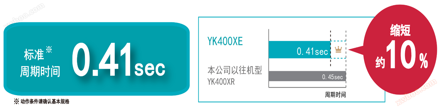 YK400XE achieves a standard cycle time of 0.41 seconds by improving the structure of the robotic arm, reducing vibration, and optimizing the motion of the workpiece, which is about 10% shorter than previous models. With high-speed and less vibration agile movements, it is conducive to improving production efficiency.