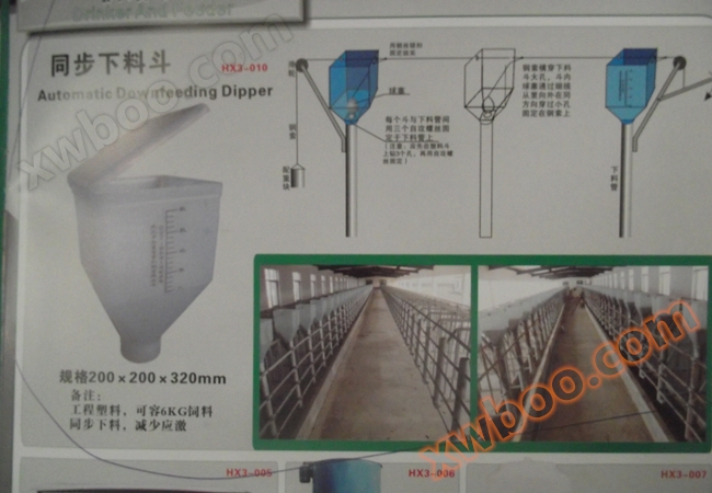 The semi-automatic synchronous feeding machine for pig farming equipment reduces the workload of workers, reduces the stress of feeding and neighing of sows, effectively adjusts the body size of sows, and is easy to install and operate. It is mainly suitable for row limit sows. One end is equipped with a lever pulley, and the other end is equipped with a hanging weight block. A thin steel rope is threaded through the rope hole of the feeding hopper at both ends, and the material plugs of each feeding hopper are connected together. When feeding, press down on the lever with force at one end, and the thin steel rope on the lever will pull back, driving the material plug to be pulled up. The material in all the hoppers in a row will flow into the hopper instantly,. When the pigs are feeding, the workers calmly add the feed to the hopper with the feed plug back in place, cover it, and prepare for the next feeding process according to the mother pig's weight and length of pregnancy. This feeding facility is widely used in medium and large pig farms.